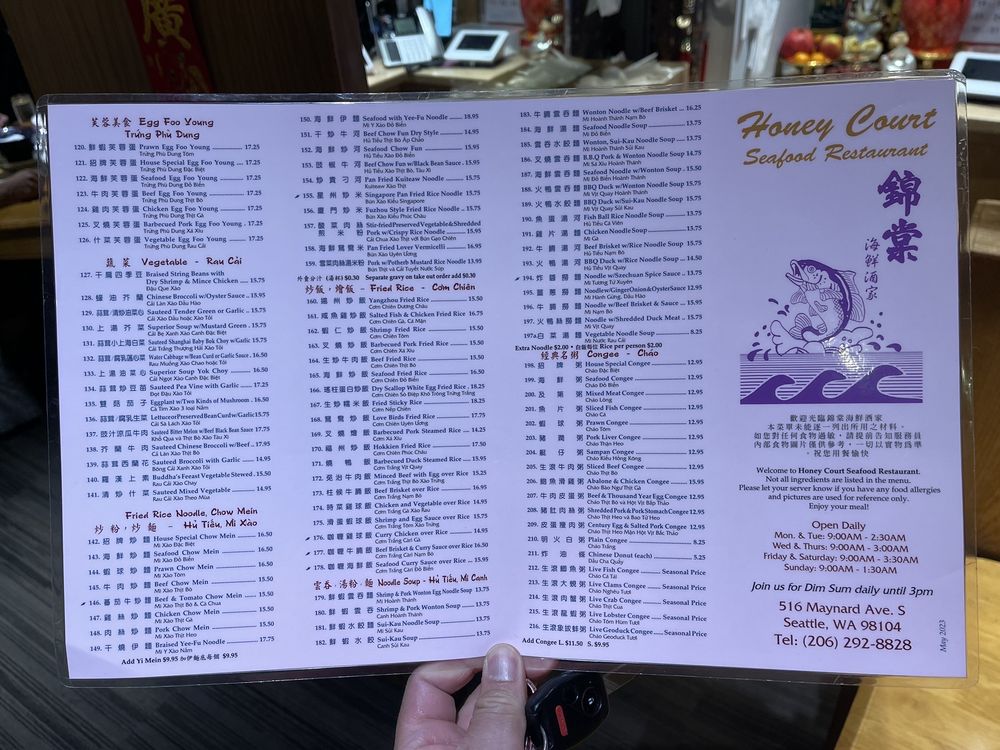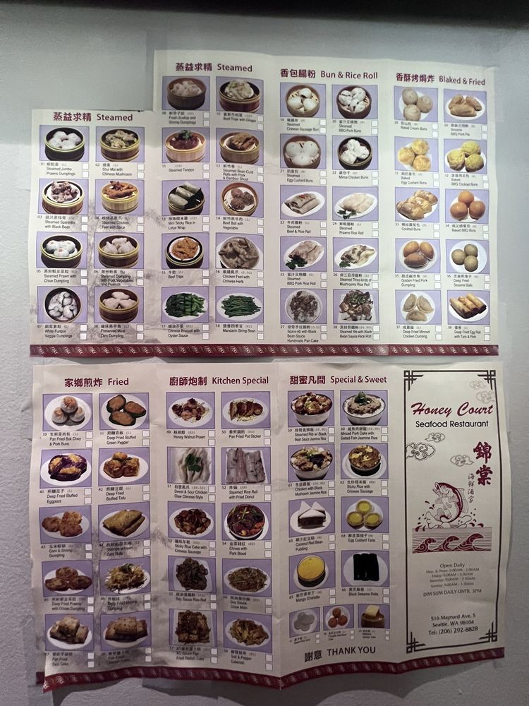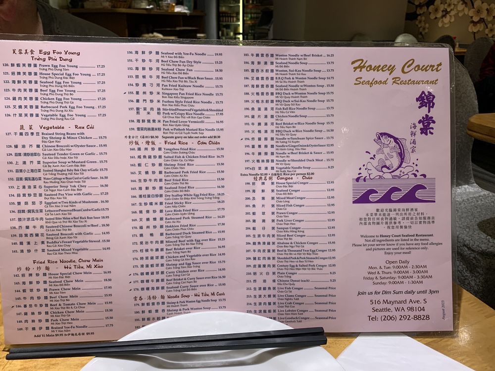 Honey Court is a popular Cantonese restaurant in Seattle, offering a variety of dim sum and seafood dishes. Customers rave about the efficient service and delicious food, with favorites like honey walnut shrimp, clam congee, and chicken feet receiving high praise. The restaurant is known for its late-night dining options, making it a go-to spot for post-clubbing meals. The menu boasts an extensive selection of seafood dishes, including live fish options cooked to order. While some reviews mention slow service, the overall dining experience is described as warm and welcoming. Whether you're a fan of traditional dim sum or looking to try something new, Honey Court is a must-visit spot in Seattle's Chinatown.
